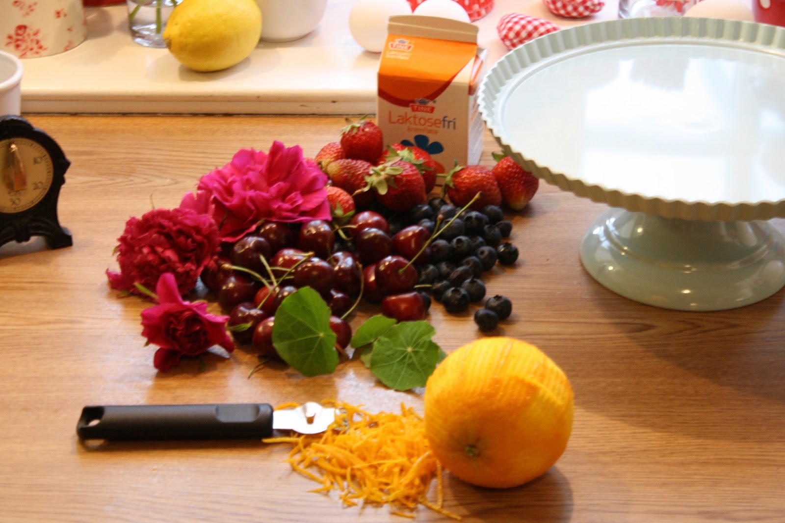 Legg resten av bær,appelsin og rosenblader rundt kanten av kaken.