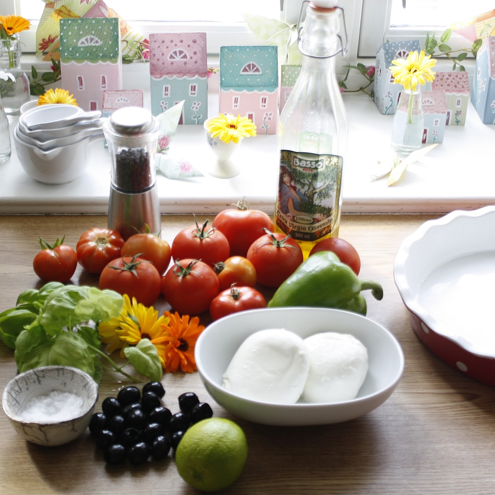 Legg tomater, paprika, oppdelt mozzerella,