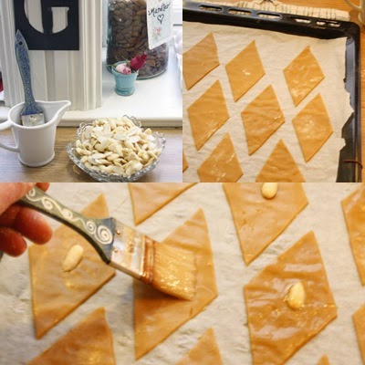 Pensel de med eggehvite og legg en halv mandel på hver snipp.