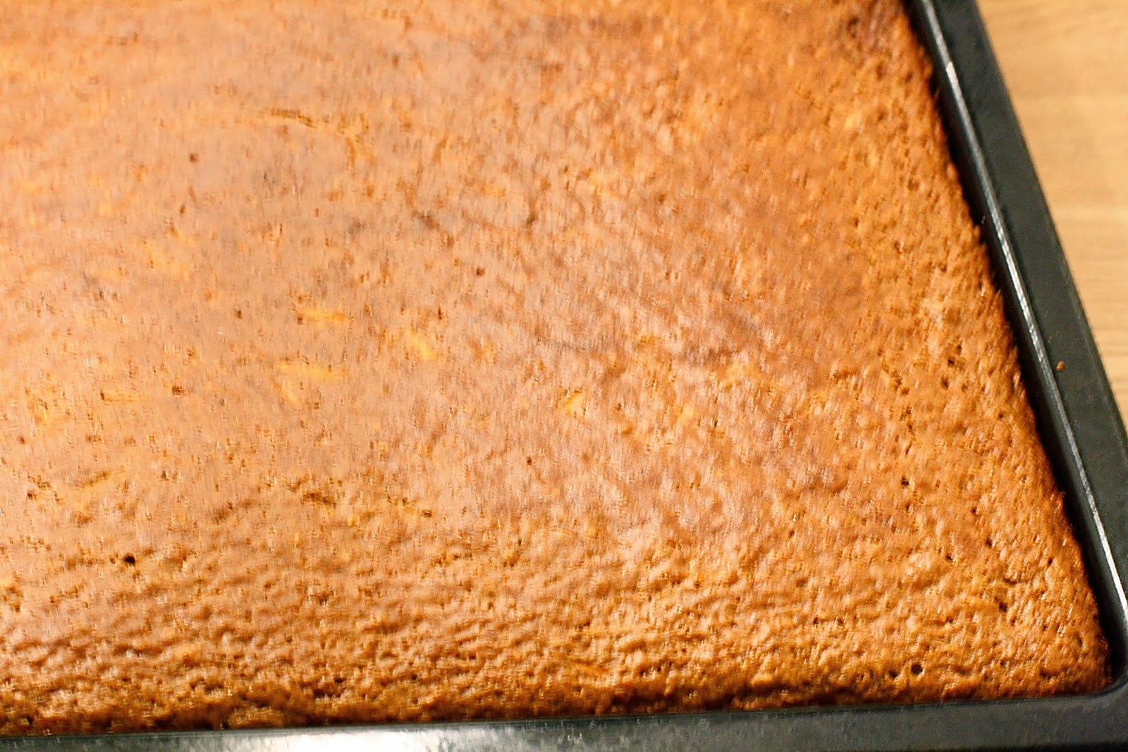 Bland sammen og hell kakerøra i en bakepapirkledd langpanne.