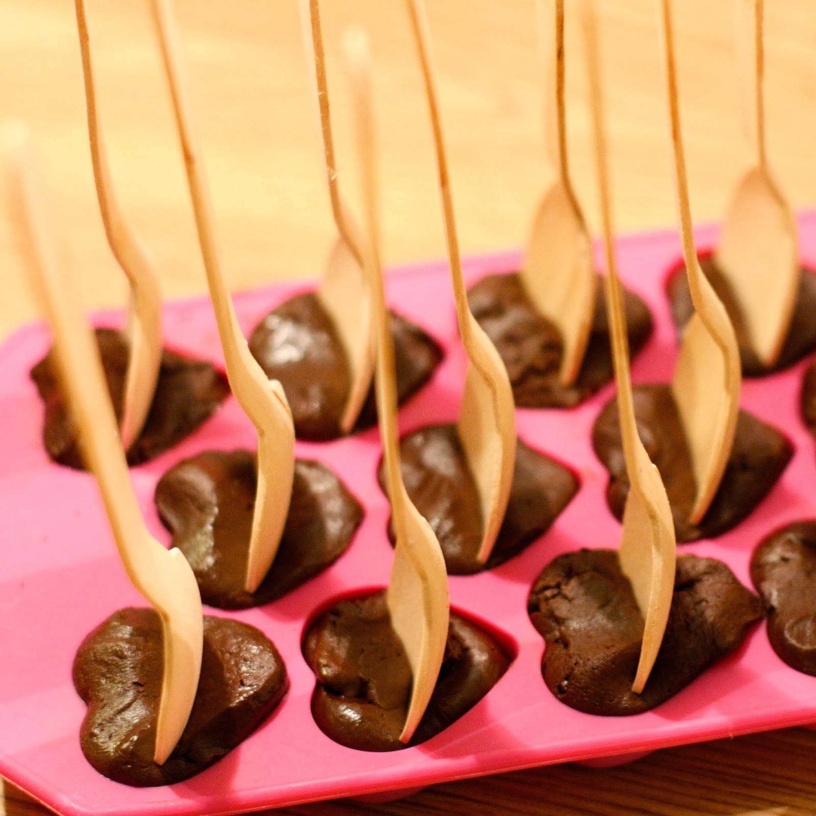 Fordel sjokolademassen i formen og en skje i hver sjokolade.