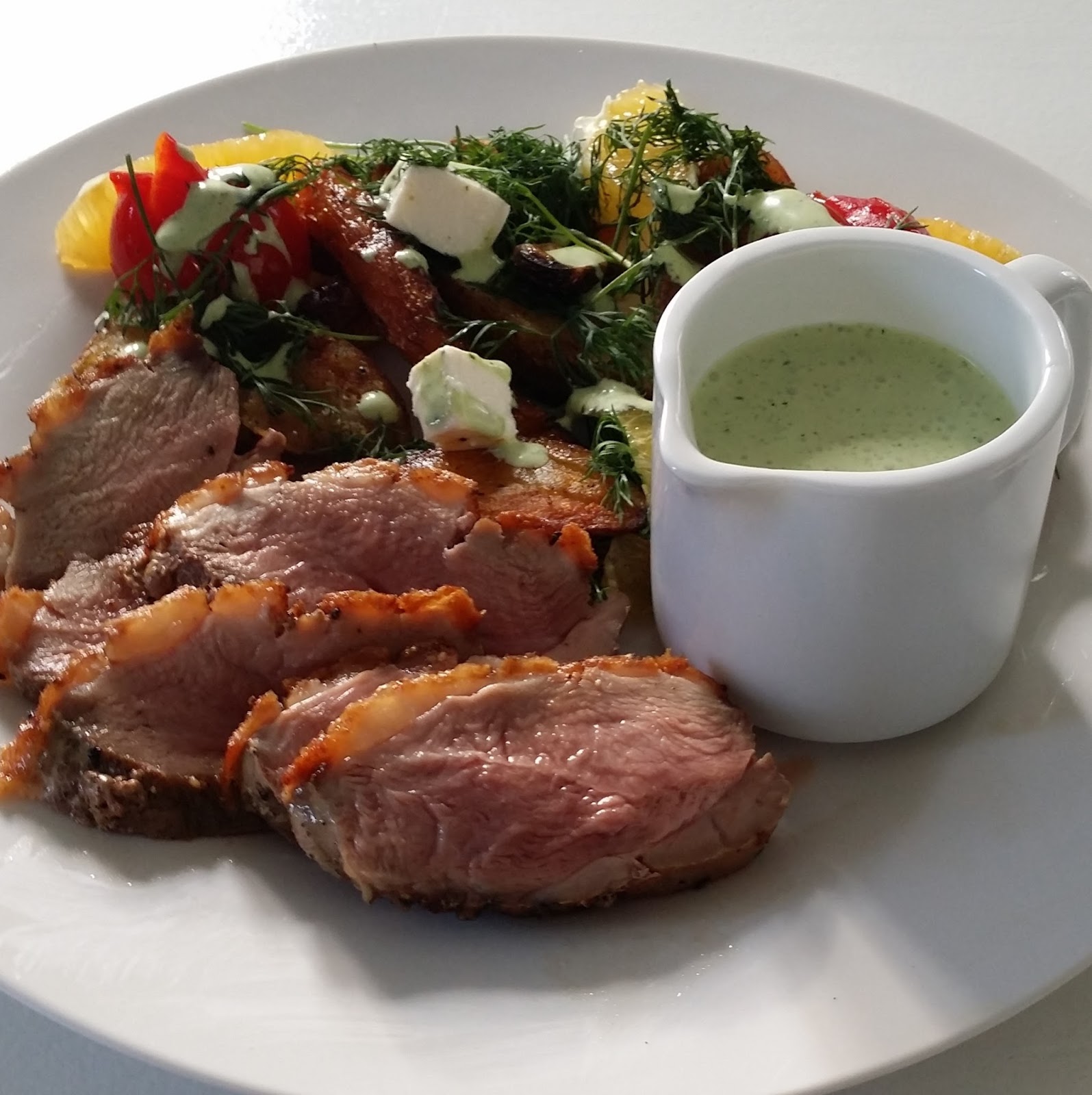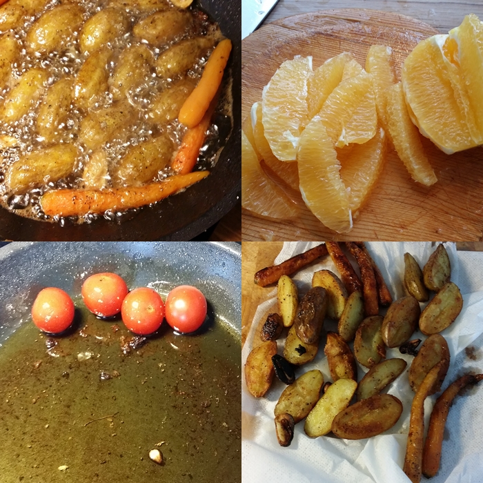 Bland sammen poteter, gulrøtter, tomat, fetaost, dill og appelsinfileter krydder med litt salt, pepper og rapsolje.