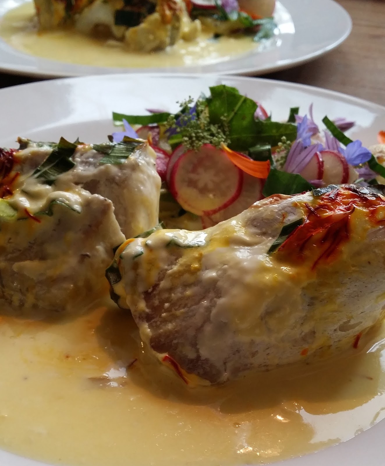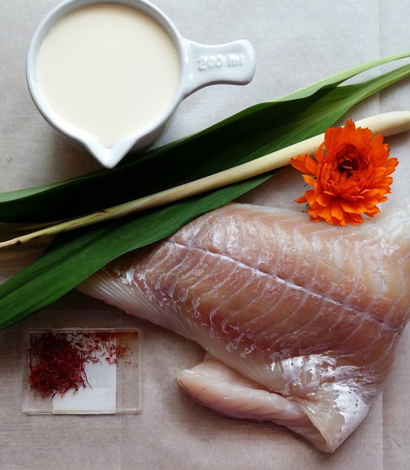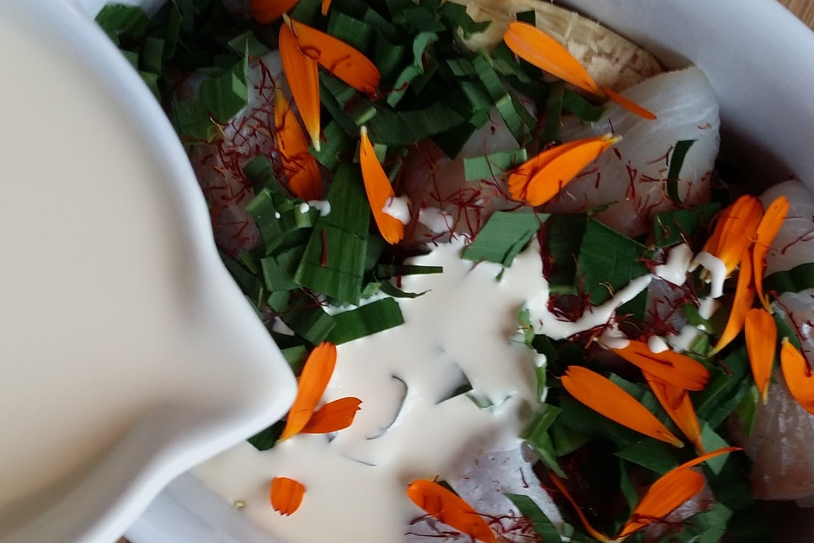 Legg safran, hakket løk og ringblomstblaser over fisken.